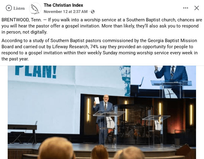 Good news about the Good News – I find myself a little bit surprised, but in a good way, about the results of this published study. Not only do 74% of pastors report regularly presenting the Gospel, another 11% report doing so two or three times each month and another 3% once a month. There are some other categories of response but the bottom line is that only 1% of SBC pastors say they never offer a gospel presentation. Read the full article here via Christian Index.