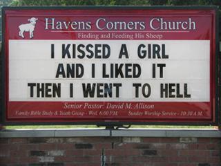 This is a real church sign located not far from Cleveland, Ohio. Mike Frizzell has been providing us with humorous and amusing church signs for some time in a regular bit he calls Signs of the Times. I couldn’t resist sharing this one also. The church says it is meant to be a “friendly” reminder to teens that the Bible doesn’t condone homosexuality. Many have misunderstood the sign’s meaning, or are unfamiliar with the pop song it is a reference to. Read the whole story here from Fox News.