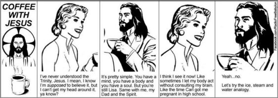 This cartoon could be very helpful when explaining Christ was God in the flesh. Some have a problem with God being in two place(or forms) at the same time. It amazes me that even some senior followers in church, with 50+ years, still think God took a ‘piece’ of Himself and made Jesus, but Jesus was only a mere fraction of the whole.