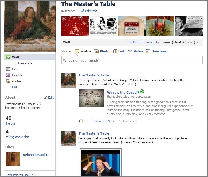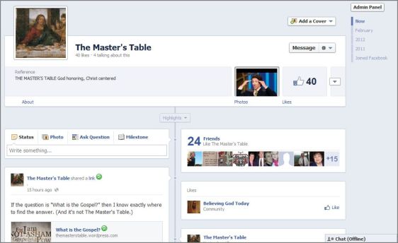 Here is a screen shot of how the Master’s Table Facebook page looks currently. The design has been basically unchanged since September 2010.