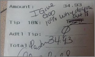 Yahoo News recently carried this story of a waitress fired from Applebee’s for posting a receipt online. Clicking on the image above will open it full size. Here’s what happened: A party of eight or more is charged an automatic gratuity of 18%. Large parties typically create problems and are more difficult to serve than smaller parties, and usually leave smaller tips. Church pastor Alois Bell wrote on the receipt “I give God 10%, why do you get 18?” and struck through the amount. She paid for the amount of the meal and left no tip whatsoever. The waitress, Chelsea Welch, found the remarks insulting but also humorous and posted an image of the receipt online. After it went viral, Pastor Bell complained to the Applebee’s manager and the waitress was fired.