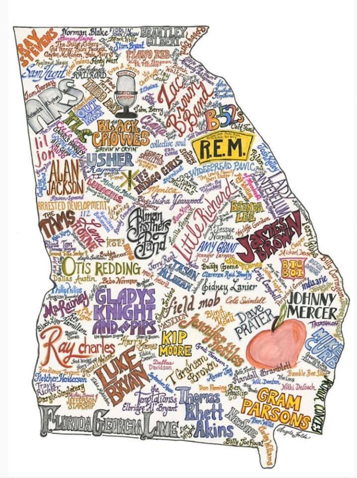 I mentioned Little Richard earlier. This map of Georgia features many bands and solo artists from the Peach State.