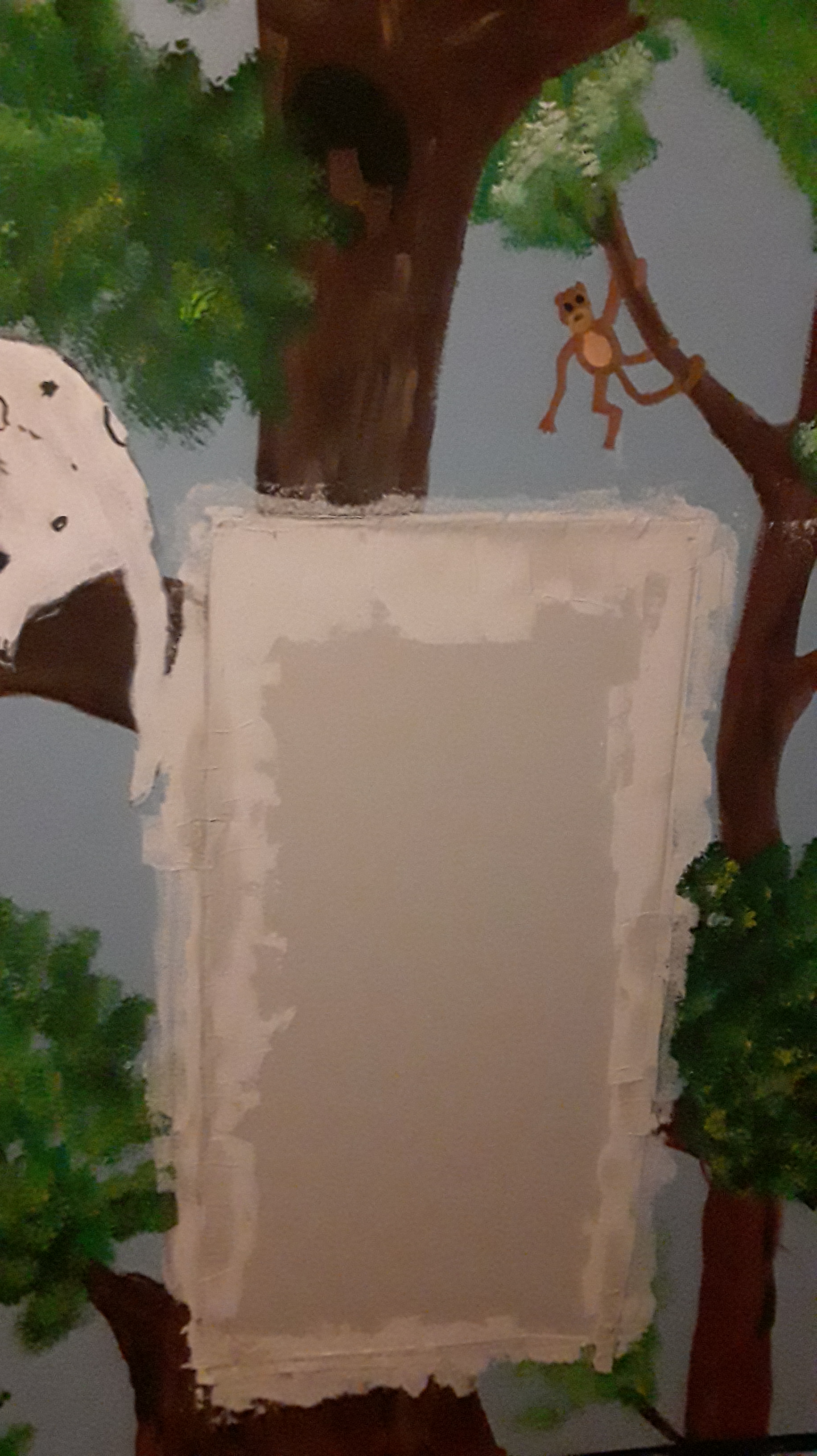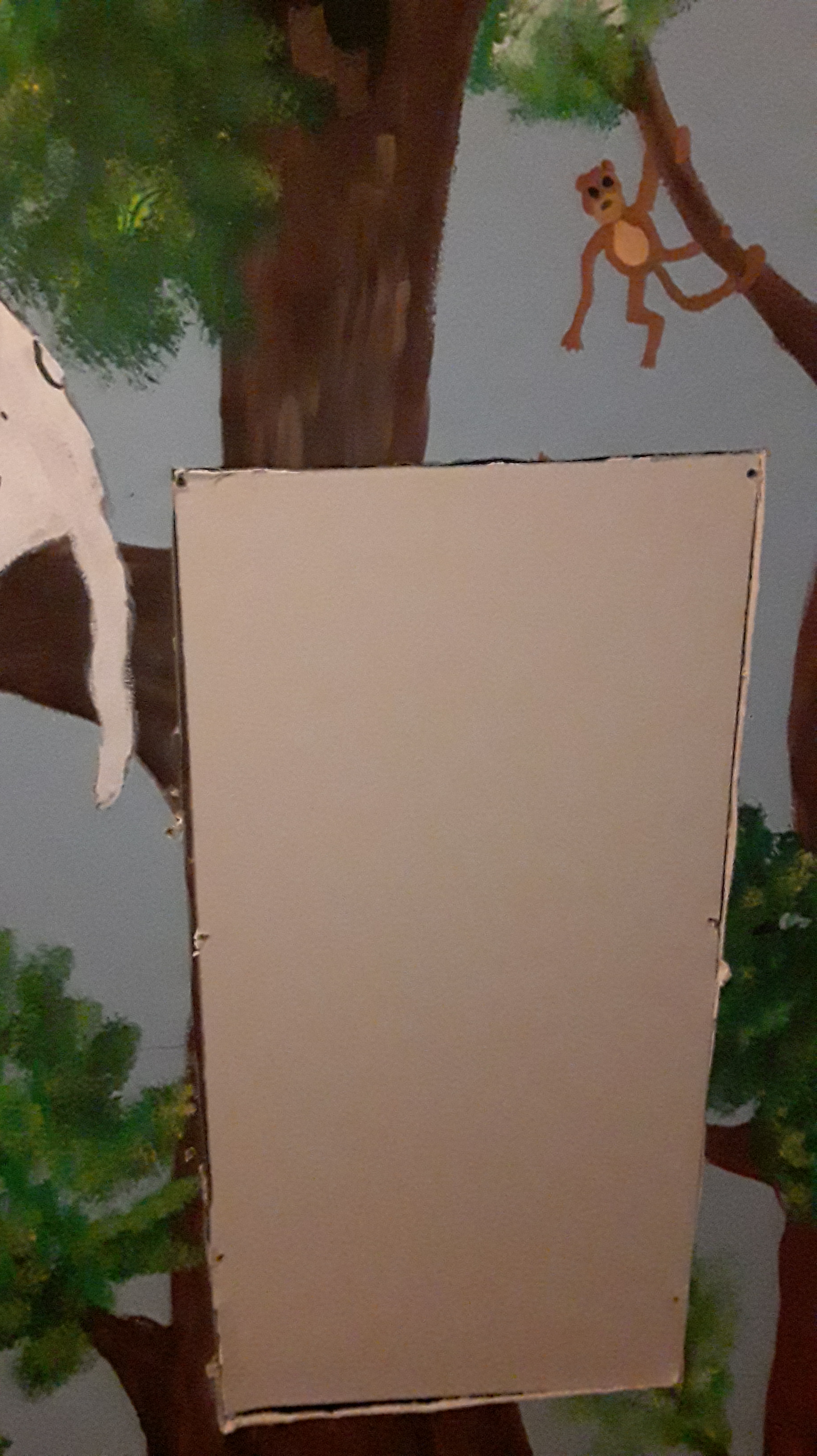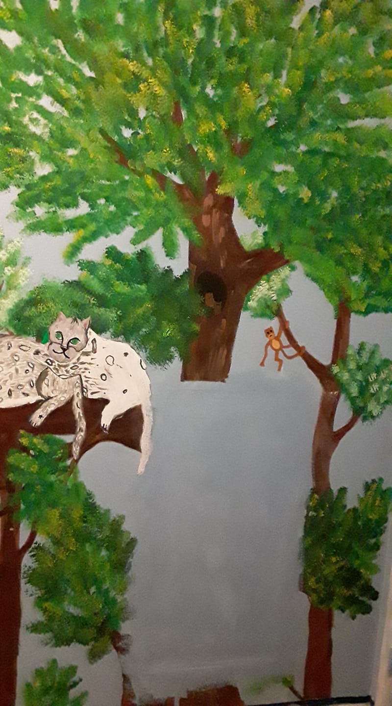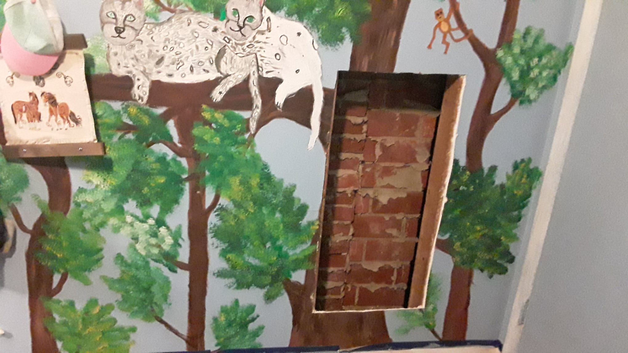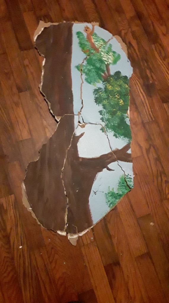 So after our daughter fell through her bedroom wall (she blames the dog for tripping her) these are the pieces that broke out. Her walls form a 360 degree panoramic mural jungle scene complete with trees, monkeys, large cats, birds and other animals. The doors and even the ceiling are incorporated into the design. So repairing damage to these walls becomes a little complicated.
