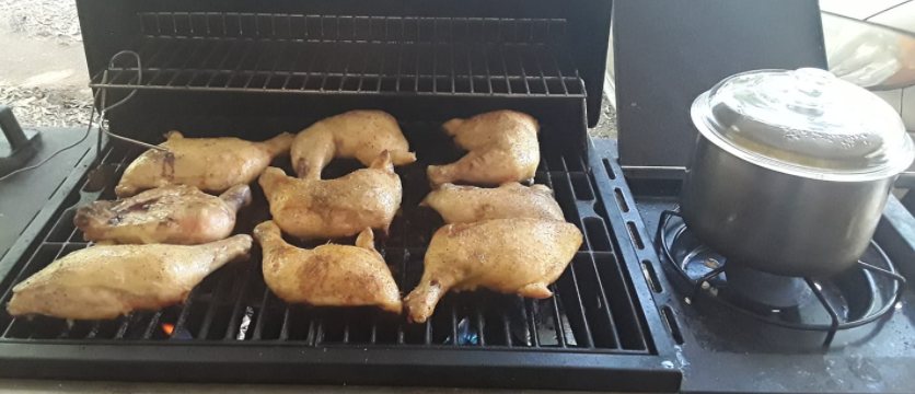Speaking of chickens – no that’s not her. These are the chicken leg quarters I smoked last Saturday. The Boston Butt turned into a 14+ hour fiasco back on July 4th. Sear these for a few minutes on each side in an iron skillet and they can be smoked in an hour and a half, maybe two hours. That’s chicken with broccoli rice on the side burner. Yummy yummy.