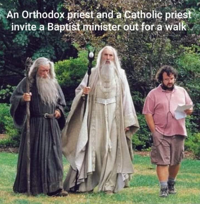 The opening meme is funny because Baptist ministers don’t often wear the religious vestments of other faith traditions. Bonus points for recognizing Gandalf the Gray, Saruman the White and director Peter Jackson.
