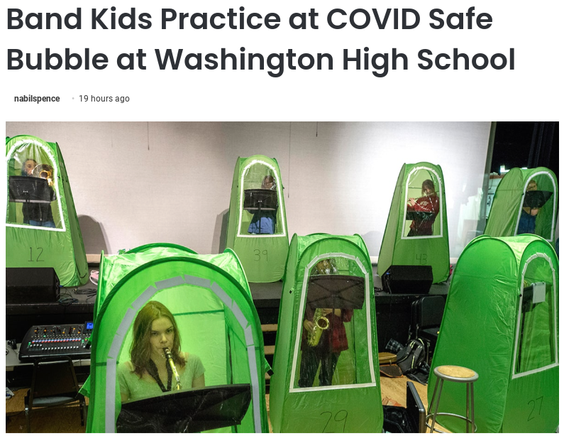 Where else but Florida? I’ve seen face masks with mouth holes cut out of them and masks that surround the entire face and musical instrument. This is the next… logical step… in band practice safety. But I wonder: if you spend 60 minutes in your personal tent, blowing hard through your brass instrument, wouldn’t you fill that confined space with millions of virus particles if you were infected? What happens when everyone unzips and exits their pods at the same time? Imagine a smoker zipped up in one these and puffing away. The smoke is coming out with the smoker, if not floating visibly in the air the soaked into his or her hair and clothing.