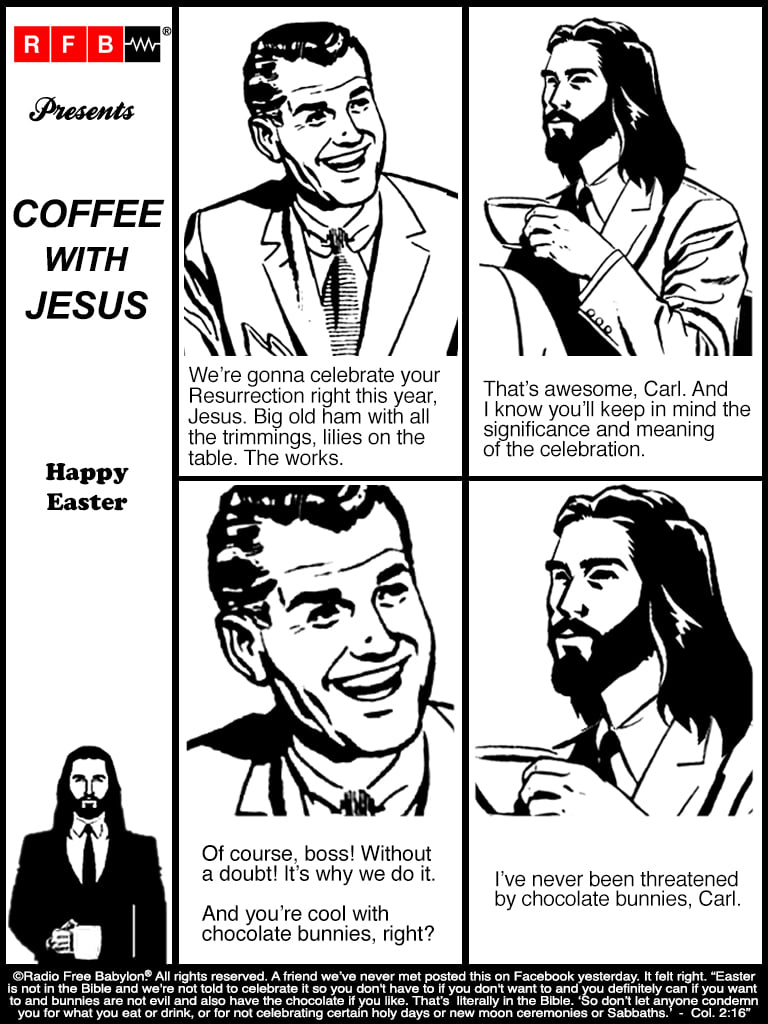 Coffee with Jesus is frequently seen in our weekly Happy Monday post. Since they changed the formatting to be more vertical there is always some type of disclaimer or commentary along the bottom edge. I used to crop that out but sometimes that part is better than the comic strip. This one says: A friend we’ve never met posted this on Facebook yesterday. It felt right. “Easter is not in the Bible and we’re not told to celebrate it so you don’t have to if you don’t want to and you definitely can if you want to and bunnies are not evil and also have the chocolate if you like. That’s literally in the Bible. ‘So don’t let anyone condemn you for what you eat or drink, or for not celebrating certain holy days or new moon ceremonies or Sabbaths.’ – Col. 2:16”