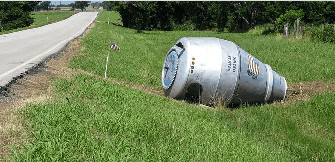 Not what it looks like. It looks like an abandoned NASA capsule from the early days of the space program. It is really the mixer from a cement truck that crashed years ago and left behind when they towed the truck as it contains several yards of hardened concrete. It has been painted and repainted by locals over the years but since 2011 has identified as the space capsule of Wiganon, Oklahoma. You can read more here.