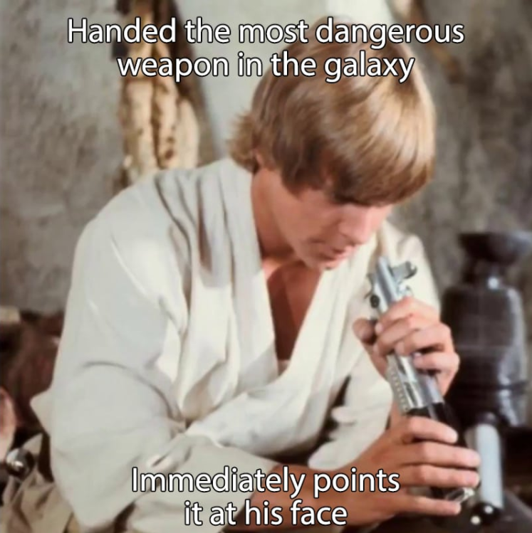 “That boy is our last hope.” Fortunately this never really happened, at least not in the movie. I’ve seen this meme before but only recently learned that this is not a screen grab from the film. This is a behind the scenes shot of Mark Hamill examining the prop. It does not depict Luke Skywalker staring into the business end of his father’s lightsaber.