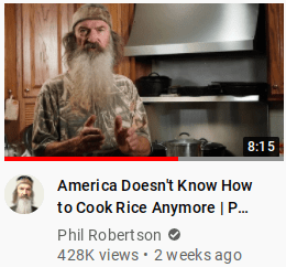 Phil Robertson demonstrates how to cook rice. He also talks about hospitality and how that is hard to practice when we limit our worship to an hour or two one day a week. The early church met in people’s homes, took meals together and literally shared all they had with each other. Phil recommends cooking a lot more rice than you need in order to show hospitality to others and maybe share the Gospel while you’re at it.