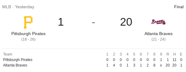 Late Breaking – I had this post in the can so to speak and scheduled to post this morning. I went to bed early with the Braves up 5 – 0 and confident they would score the win. I got up to discover they made MLB history with 7 HR’s and having scored 20 runs on 20 hits. I never want to see my team lose that badly and honestly I’m okay with missing them win such a lopsided contest.