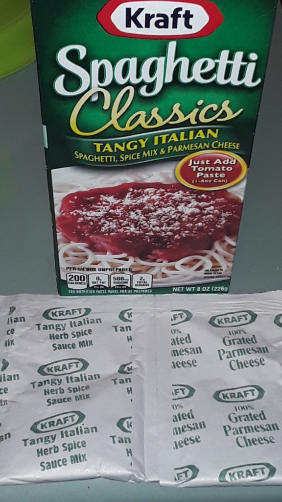 Kraft Spaghetti Dinner – I can’t believe they still sell this product. It’s only 8 oz, half the size of a regular box of spaghetti pasta. The directions call for mixing 12 oz of water with a 6 oz can of tomato paste, purchased separately, and adding the herbs and spices included. I have a friend IRL with fond childhood memories of this being one of the only “homemade” dishes his mother ever prepared. When I worked at Kroger a woman told me she buys these just to get the spice packet; she throws the noodles away and makes her own sauce but needs that flavor pack to do it. I never had this as a kid but apparently its popularity has risen to cult following status.