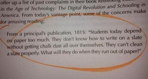 What will they do when they run out of paper? In the 1950’s, a survey of high school teachers revealed the number 1 issue in the classroom was chewing gum. Fifty years later, giving teachers the same survey, chewing gum didn’t even make the list. When I was in elementary school, in the early 1980’s, our school had a computer lab of sorts. There were probably 20 computers in the whole school and I remember going once or twice and playing some sort of arithmetic game. By the time I got to high school, each classroom had five IMB clones and there was one reserved for the teacher’s own use. The new high school that opened just a few years ago has a library perhaps because they feel duty-bound to tradition to include one. There are very few books but lots of places to sit down with a laptop; very few bookshelves but plenty of wifi.