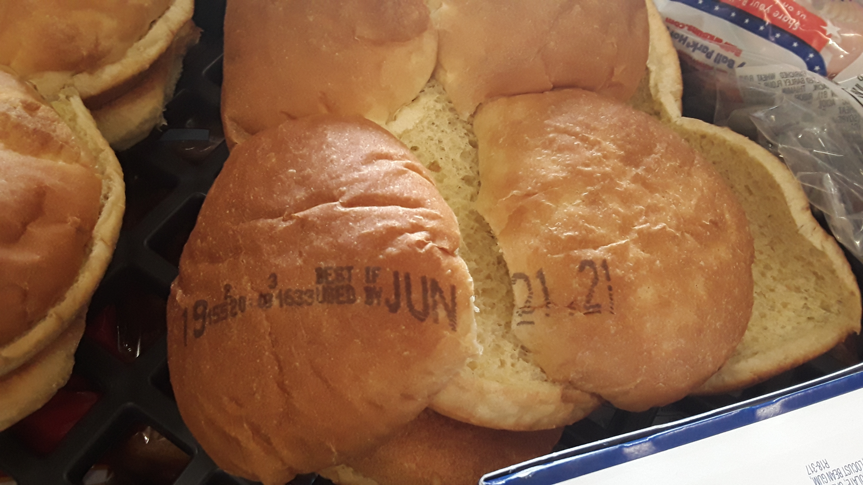 There’s something you don’t see everyday. These hamburger buns missed being bagged but still got a date stamp. If this arrived at a grocery store in this condition they would be thrown away and no customer would ever see them. I volunteer at a food bank and there again, no clients picking up food saw this either. I snapped as a pic as this rack full of bread products was unloaded from the truck. The flats were stacked 10 or 12 high and if this hadn’t been on top I still would not have seen it. I’m impressed by how clearly letters and numbers can be printed onto soft bread. Regardless of the date, since these buns were not bagged at all they were already rock hard.