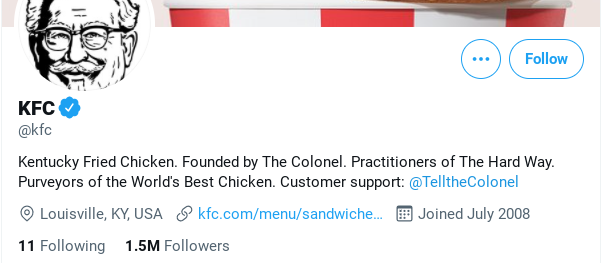 The official Twitter account of KFC follows exactly 11 people: the five members of the Spice Girls and six different guys named Herb. That’s right, The Colonel follows 11 Herbs and Spices.