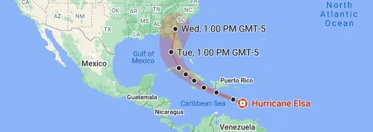 Hurricane Elsa just became the year’s first tropical storm to reach hurricane status. Currently playing havoc in the Caribbean it could make landfall in Florida early next week then hit the Georgia coast. If your holiday plans include the beach, might want to get out of there sooner rather than later.