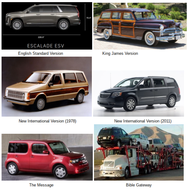 I put together a series of images a couple of weeks ago imagining cars as Bible versions. This condenses everything down to a single image. Bible Gateway is a recent addition.