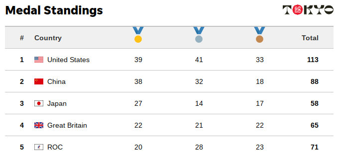 After trailing China for two weeks, sometimes by quite a bit, the United States pulled ahead in the gold medal count to finish with 39. The US won a total of 113 total medals, fewer than some recent Olympic Games despite there being more events in Tokyo than ever before. The hardware was more evenly spread out in these games, with more countries winning at least one medal than ever before. Click here for a complete breakdown of US medal winners and links to much more from USA Today. The Winter Games begin in 179 days.