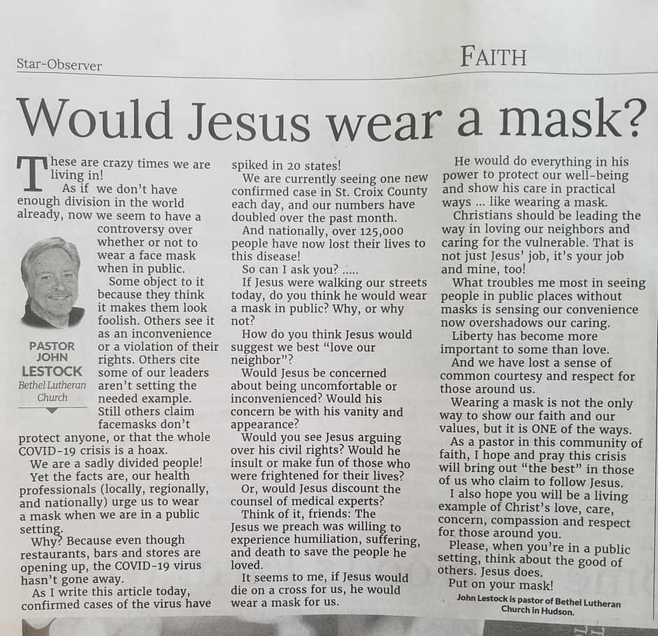Would Jesus wear a mask? It is unfortunate that our response to Covid-19 is deeply rooted in politics. This is not a political post and I try with all the long-suffering patience I can muster to divorce discussions about health care from the political entanglements. I find the logic and reasoning of Pastor John Lestock to be sound. If the image above is too small to read, clicking on it should open a new tab. You should be able to zoom in if the full screen size image is still too fine of a print. Read the article with an open heart and open mind.