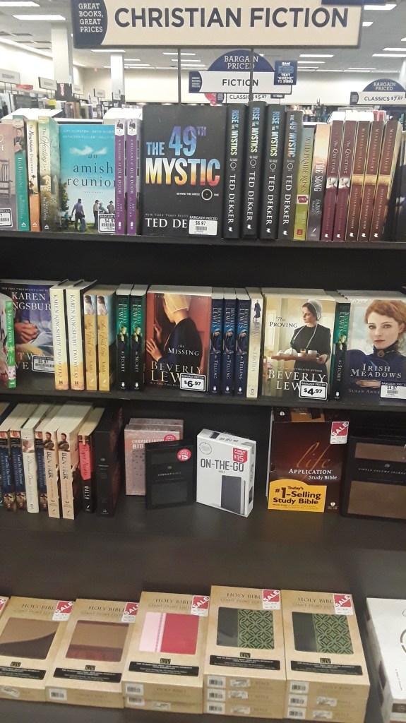 Don’t make too much of this. I found it interesting and cracked a little smile. When I posted this to a Facebook group some responded with the angry face emoji and others suggested that people buying Christian fiction might be the same people that buy Bibles. It is possible, I guess, that some atheist placed these here to make a protest statement; it is equally possible that whoever built this display meant no offense and it never occurred to him or her that some might take it that way.