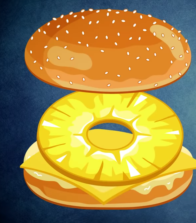 The pork McRib sandwich, as well as Chicken McNuggets, were added to McDonald’s menu in the early 1980’s. So many billion McD’s hamburgers were being served that it created supply chain problems in the beef industry. The iconic Fillet-O-Fish has been around much longer, since the mid 1960’s. That menu item fills a niche market for Catholics and others that do not eat meat either during Lent or in some cases every Friday. Shown above is the Hula Burger, the non-hamburger item Ray Kroc thought would sell better than the Fillet-O-Fish. Long story short: it did not.