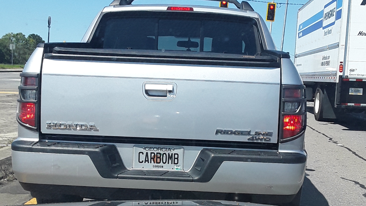 This I could not believe. I believe someone would ask for it, what I can’t believe is that any government agency would go “Yeah, that seems fine. We’ll make you a license plate that says CAR BOMB.” I took this pic myself so in this case seeing is believing.