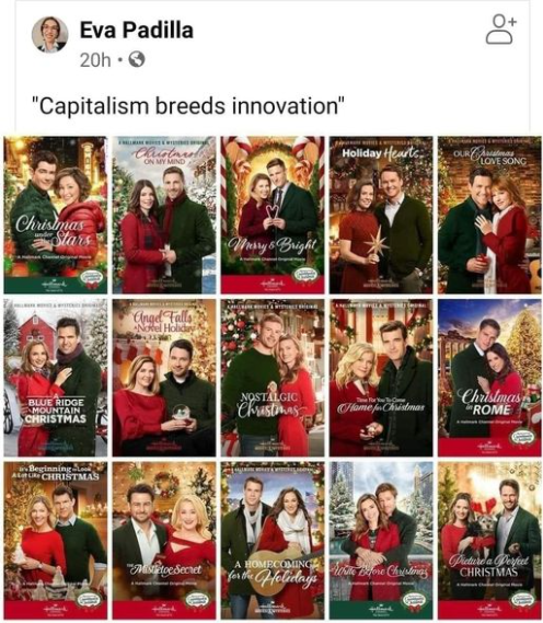 The joke here is that capitalism has not led to innovation since every Hallmark Christmas movie looks exactly the same. Here’s the thing though, fans of those movies know exactly what to expect because, and this is going to hard for some people to believe, that’s what they want. If you are able to go out and get what you want, that’s a fine example of capitalism. I know it’s a meme and we’re just supposed to smile and move on but let me further break this down. Hallmark Channel is one channel we get from our cable provider out of like 400. We could also watch Netflix, Hulu, Disney+ or Prime Video. In the past week I have seen Home Alone, Elf, Paul Blart Mall Cop and Die Hard but not a single thing on the Hallmark Channel. That brand creates a certain culture and everything inside it’s circle is going to have a certain look and feel to it. If I carried you into a Walmart blindfolded, you would not think for one second you might be in Target when the blindfold was removed. Starbucks does not look or feel like Dunkin Donuts. You can be critical of Hallmark for making 500 movies with the same plot if you wish, but hey, they’re not going broke over there. Only an idiot would quit milking a cash cow.