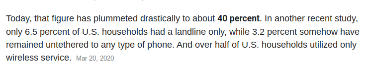 40 percent of American homes still have a landline but very few of those homes have only a landline. Over half of American households have only wireless phone service, which has been us since 2015.