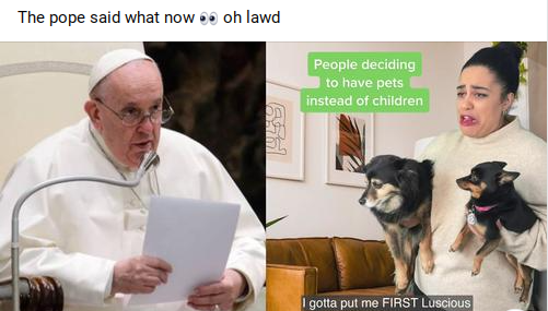 The pope said what? Pope Francis said this week that people choosing to have pets instead of children is selfish and takes away our humanity. My theory has long been that no news is good news and the fact that CBS News, CNN, The New York Times and others covered this story means that Ukraine has not been invaded, an airport has not been bombed by terrorists, etc. Never question why news outlets are covering a puff piece. The lack of real news equates to good news for the rest of us. Now to the issue of people not having children: the population of the world will soon reach 8 billion. When the sheer number of human beings exceed the earth’s capacity to produce food for them all, you are going to see selfish behavior that diminishes our humanity for real.