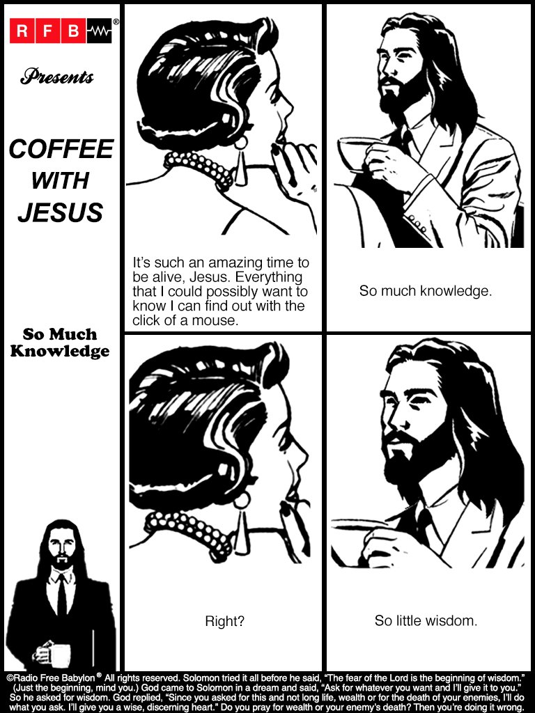 Coffee with Jesus took some time off for the holidays but they have been back at it for a couple of weeks now. I replied to this comic by saying “We have the collected wisdom of all human history available in the palm of our hand. We use this technology to post funny cat pics and argue with strangers.” RFB responded by saying that even though they hit the laugh emoji it’s really more sad than funny. When I said that sometimes you have to laugh to keep from crying they simply wrote “WISDOM!”