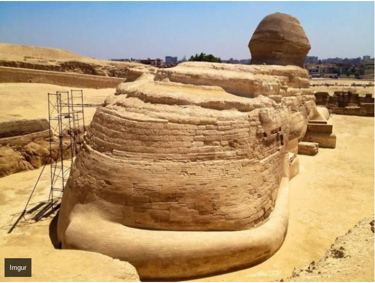 The Sphinx, with the head of a king and body of a lion, has a tail. Did you know the Sphinx has a tail? Lions have tails so it stands to reason but we usually don’t get this angle. The Sphinx and Great Pyramids are usually photographed so they appear isolated in the desert but you can clearly see a city landscape in the image above. As a matter of fact you get a pretty good view of the surviving Wonders of the world from inside the local Pizza Hut.