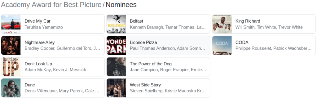 If you’re into the Oscars you probably already know that 2022 nominations are out. If you’re not into following the Oscars you probably don’t care. Nicole Kidman is nominated as Best Actress for her role as Lucille Ball in Being the Ricardos as is Jessica Chastain for her portrayal in The Eyes of Tammy Faye. I might get around to seeing those two films, eventually.