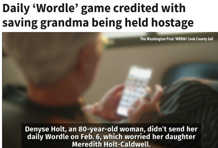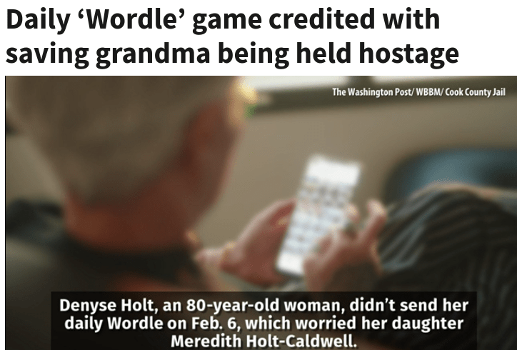 When Denyse Holt did not send her daily Wordle, her daughter had a neighbor check on her. Her car was at the house but no one answered the door. That’s when Meredith Holt-Caldwell called police. Holt was being held in her home against her will and after a 6 hour police standoff, she is free and a suspect is behind bars. I would say that has more to do with keeping a regular routine than the actual Wordle game but let it have its 15 minutes. At least it’s still free.