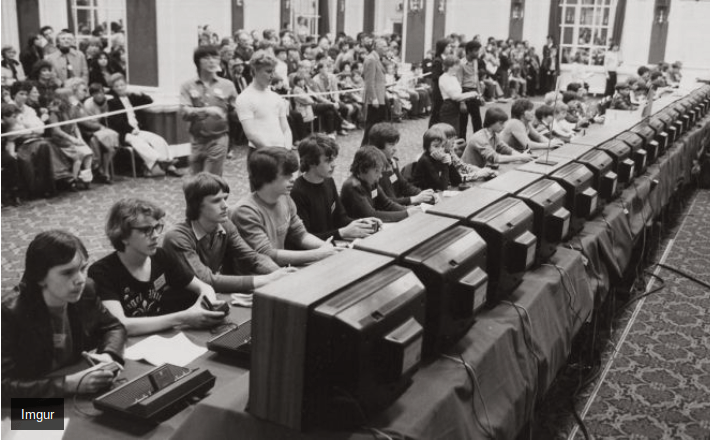 Atari held the first video game tournament in 1980. Just look at all those CRT’s. When I was a kid most people only had one t.v. per home and only “rich people” had a second television or two phone lines.