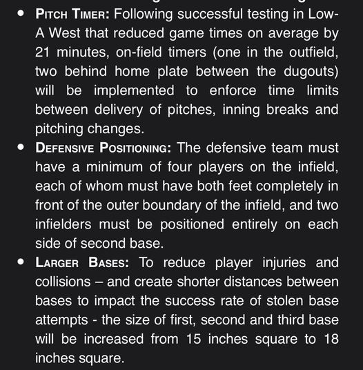 Baseball is back! The MLB lockout ended after 99 days and even though opening day is pushed back to April 7th we will get a full 162 games season. Shown above are some of the new rules that will apply not this season but beginning in 2023. It looks like they are making it tougher to play defense in order to get more runners on and potentially lead to higher scoring games. But if the pitch timer is meant to make games shorter, putting more men on base will lengthen innings. The two effects may cancel each other out.