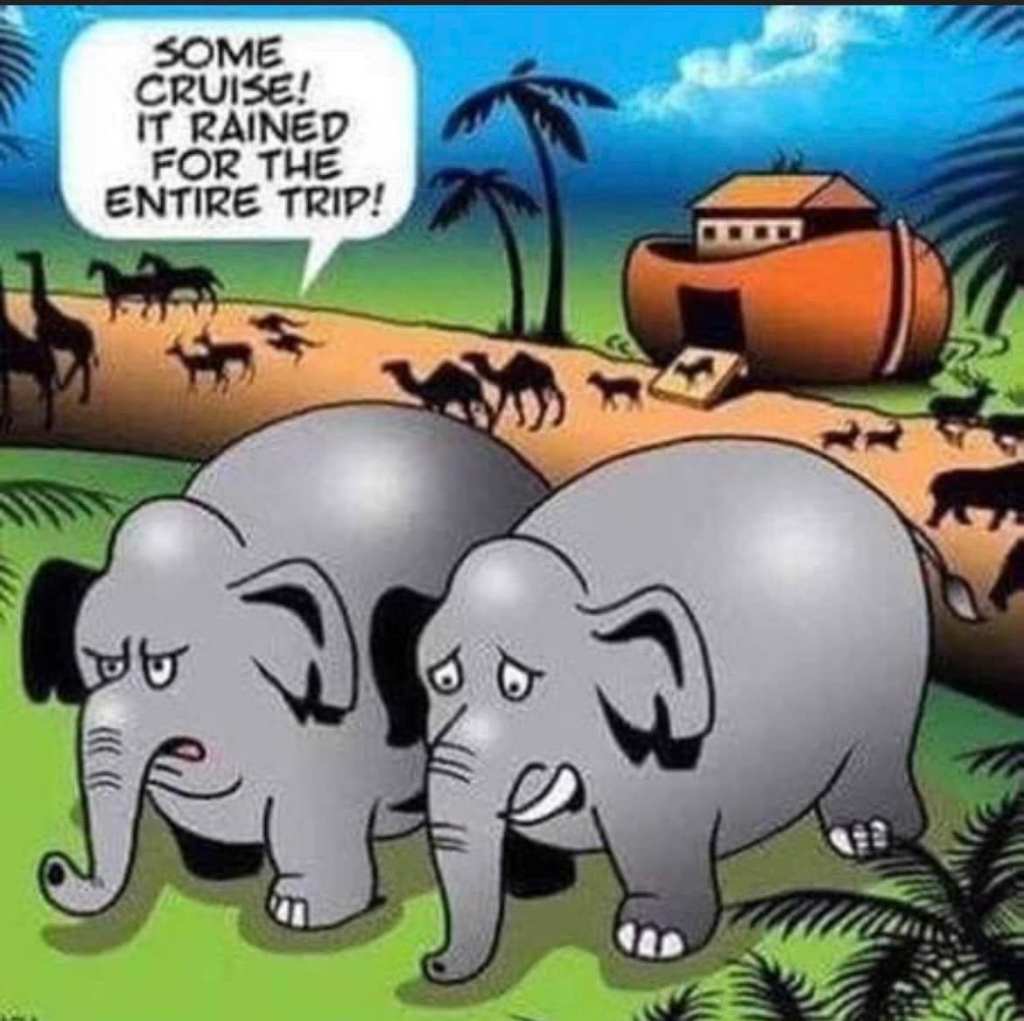 I didn’t want to be pedantic when I saw this on Facebook so I just kept scrolling. I will go ahead and be pedantic here. It did not rain for the entire trip. It rained for 40 days and nights and the Bible says the fountains of the deep were broken up. It took a long time for those floodwater to subside. The people and animals on board the ark sailed for right at one year. It actually gets more involved than we are going to here but 370 and 377 days are prevailing schools of thought while an argument could be made the flood lasted one year minus one day. But it did not rain the entire trip. There were no ports of call, no souvenirs to bring back, the ark did not have a pool, there were probably things to complain about but look on the bright side: it beats dying in the flood.