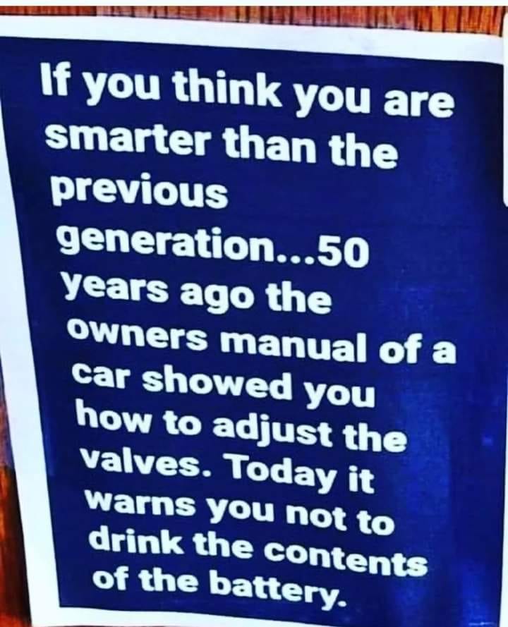 Having said that… let’s consider some of those critical thinking skills. It’s true that a modern car’s owner manual will not give you information on adjusting the valves. But it’s not because people today are less intelligent than 50 years ago; it’s because adjusting the valves is no longer necessary. There is no adjuster because direct overhead cams have no pushrods or rocker arms. You don’t have to adjust the carburetor air fuel mixture or idle speed because one, carburetion has been replaced by fuel injection and two, your car’s ECM computer makes continual adjustments by monitoring intake air, RPM’s, and the amount of oxygen and carbon dioxide in the exhaust system. 50 years ago most cars didn’t last for 100,000 miles but today we don’t even change spark plugs until they have 100,000 miles of use on them. Cars today self-diagnose mechanical and electrical problems. They know where they’re going, remember where they’ve been, and some even park or drive themselves. So tell me again how smart we were 50 years ago?