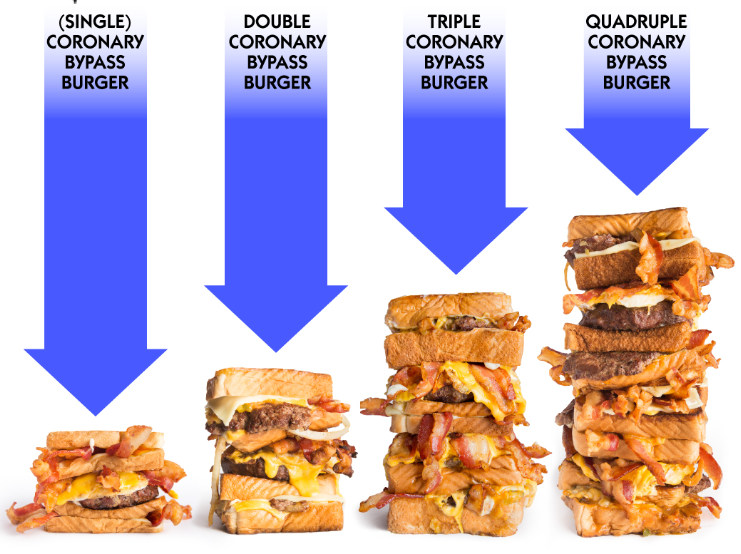 Hamburger Harbingers of Death – I shared on Facebook this week that Burger King gave me a Triple Whopper after I ordered the Texas Double Whopper. Then I started gettings links to articles about “20 best burgers in Atlanta” and such. While they also serve regular sized portions that normal people eat, shown above are the stacker options that can be part of a food challenge at an establishment called The Vortex. (It’s a bar & grill but they don’t card you when ordering. All patrons must be 21 or over to get in the door.) They stack hamburger patties, cheese and bacon in between patty-melt sandwiches made on Texas toast as the buns. These are served with a side of fries and tots covered in cheese goo. The Triple, when consumed with its side dish, comes in at over 7,000 calories and the quadruple at a staggering 10,000+. That’s more than a “regular person” eats in 4 or 5 days. I’d still like to try the Texas Double Whopper someday. I’ll look inside the wrapper before I drive away next time.