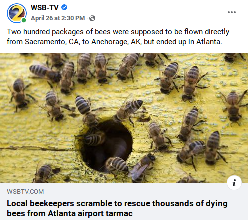 I’ve never had an airline lose my luggage. I did fly all the way Germany one time only to find out my bag was still sitting in Atlanta. It was never lost, just not where I wanted it. Five million honeybees, about 800 pounds worth, that were supposed to go directly to Anchorage were misdirected to Atlanta. After four days the bees began escaping and cargo workers took them outside. By the time Atlanta beekeeper Edward Morton was contacted and arrived at the airport, most of the bees had already died from the heat. Alaska has no native bee population for the production and collection of honey. Delta Airlines has apologized for, in their words, the unfortunate situation.