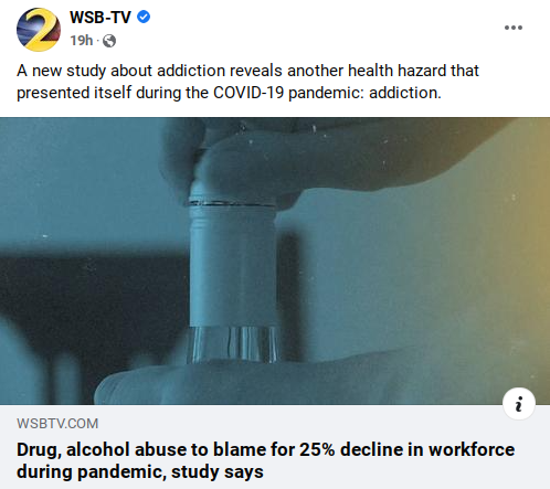 This story out of Atlanta looks at stats in Georgia but represents a similar trend nationwide. A third of workers surveyed admit to drinking on the job during the pandemic. Alcohol and substance abuse increased by 9% in 2020 and 26% in 2021. Read the full article here.