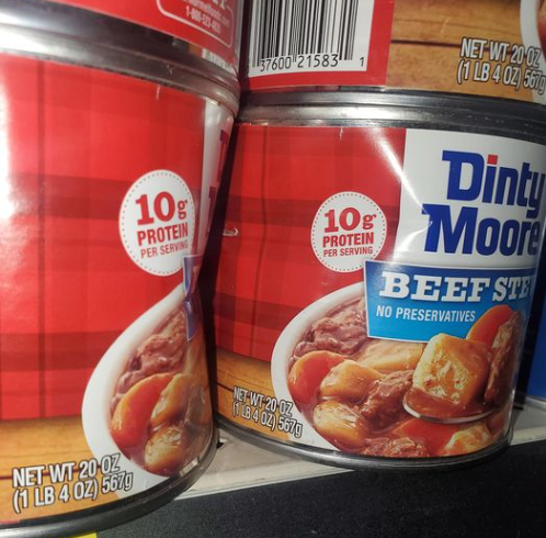 A friend IRL took this picture at a local Dollar General Store. The can on the left has a small dent. The can on the right denty more. True story.