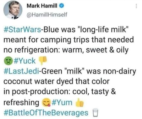 Mark Hamill was asked to review the famous blue milk he drank in Star Wars, comparing then and now.