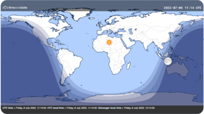 “I’m gonna soak up the sun.” That’s what Sheryl Crow said and this would be the week for it. On July 8th, at 7:15 AM Eastern Daylight Time, 99% of the world’s population was in the sun. About 6.4 billion were in daytime with another 1.2 billion experiencing twilight. Looking at the world clock image it appears only Australia and some Pacific islands were in the dark at that moment. Source: earthsky.org