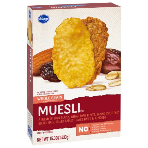 The original muesli was created in Switzerland around 1900. A physician by the name of Maximilian Bircher-Benner came up with the dish as a remedy for his hospital patients. (In the United States, two brothers named Kellogg invented corn flakes at a sanitarium in Michigan and as that business took off a former patient, C.W. Post, began a rival company. There is a strange correlation between doctors, patients, hospitals and breakfast cereal.) If you grew up in Europe, especially Switzerland or Germany, muesli may have been a staple for breakfast or even lunch. In the United States I never heard of it until Kellogg’s began marketing Mueslix. Pictured above is a store brand box of Muesli from Kroger. I discovered that cereal a couple of years ago while working at Kroger, otherwise I wouldn’t know it exists. I can buy Muesli still but not Kellogg’s Mueslix… at least in the store. I have now learned that i can order Mueslix from Amazon.com or even Walmart.com. Our local Walmart doesn’t put it on the shelf but Kellogg’s makes it and I can order it from Walmart and get it with two-day shipping. Just like I can buy store brand bran flakes at Walmart and Food Lion but cannot find Kellogg’s or Post bran flakes anywhere. Those brand name cereals are also still produced but not carried by grocery stores, at least where I live. Your mileage may vary.