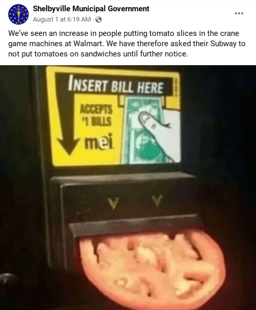 Fake News. I first thought this looked like a fun headline to share in the Deja Vu. Shelbyville Municipal Government is a parody webpage. None of the stories are real and as a matter of fact it is ambiguous as to where Shelbyville is supposed to be. What this really represents is a dig at SubWay because only a tomato slice as thin as a piece of paper would even fit into a bill changer. Any normal person making a sandwich would have thicker slices.