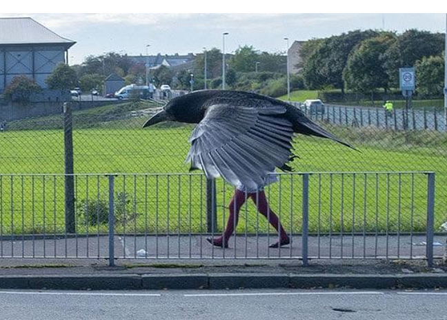 Unintentional optical illusion. The person walking is not in costume and has no idea they will be confused later with Birdman. Nor is this a bird with human legs in case that’s where you went.