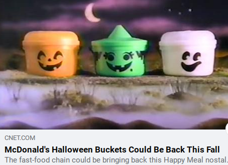 The adult size Happy Meal is a legitimate promotion at McDonald’s that will begin Monday, October 3rd. It will feature a Big Mac or 10 piece McNuggets, fries, drink and a throwback style McDonaldland character toy all in a box that hopeful reminds customers of their childhood. The return of the Halloween Boo Buckets is a leaked story that McDonald’s has neither publicaly confirmed nor denied. -via CNET