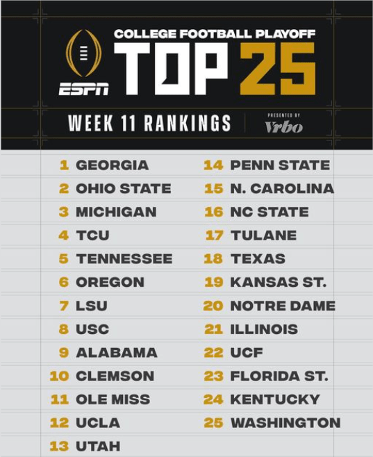 These rankings are from the College Football Playoff Committee, the people that determine who goes on to the postseason. The system may not be perfect but it is light years ahead of the previous Bowl Championship Series (BCS) that it replaced. Expect at least one more major shakeup in the top four when Ohio State plays Michigan in a couple of weeks. Today Ohio State plays the unranked Indiana Hoosiers at noon, Alabama plays Ole Miss at 3:30 and Georgia plays Mississippi State at 7:30. I expect all of those games to be very one-sided with no surprises but some bold predictions have Ole Miss giving Alabama a third loss.