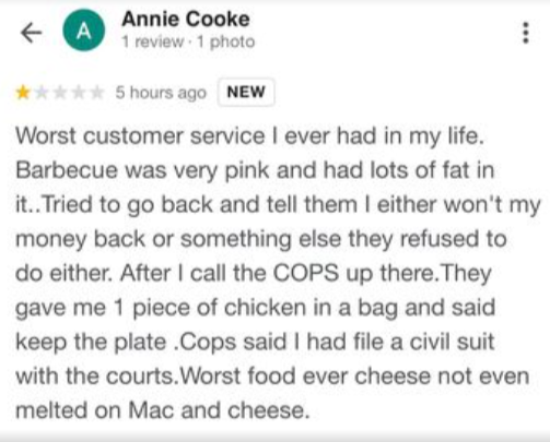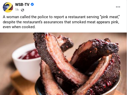 Raleigh, North Carolina – Debbie Holt has been the owner of Clyde Cooper’s Barbecue for 15 years, a business first opened in 1938. She knows how to smoke meat, let’s establish that fact. When a customer named Annie Cooke tried to return her order saying it needed to be cooked some more, Holt explained “Oh honey, that is the pink from the smoke.” Other nearby customers tried to explain the smoke ring and what happens when porked is smoked. Holt explained that if were cooked longer it would still be pink. After leaving the restaurant Cooke called 911. The police of course were obligated to show up but the officer rolled his eyes, Holt said “the food is done,” the officer said “I got you” and then left. Cooke says she is considering filing a civil lawsuit. Here is here one star Google review, that has since been deleted: