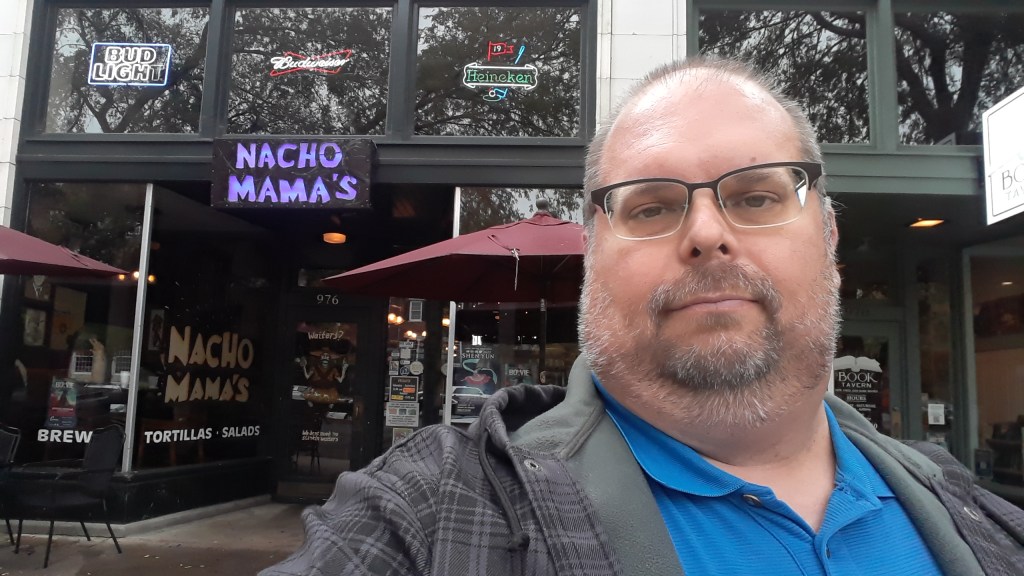 Speaking of Augusta – When Teresa and I met at college in 1997, her family was living in Augusta (technically in the suburb of Hepzibah). Her parents moved a few years later and neither of us have back to Augusta in the last 20 years. I drove down the street and past the house where they lived for 15 years. I drove to the church they attended, where we were married, but the entire footprint of the campus changed and the new sanctuary is a few hundred feet from the one we knew. We talked about a downtown hangout called Nacho Mama’s but never actually made it there together. I finally made it Tuesday. All the menu items have clever names. Shown above is a large pulled pork burrito called The Godfather.